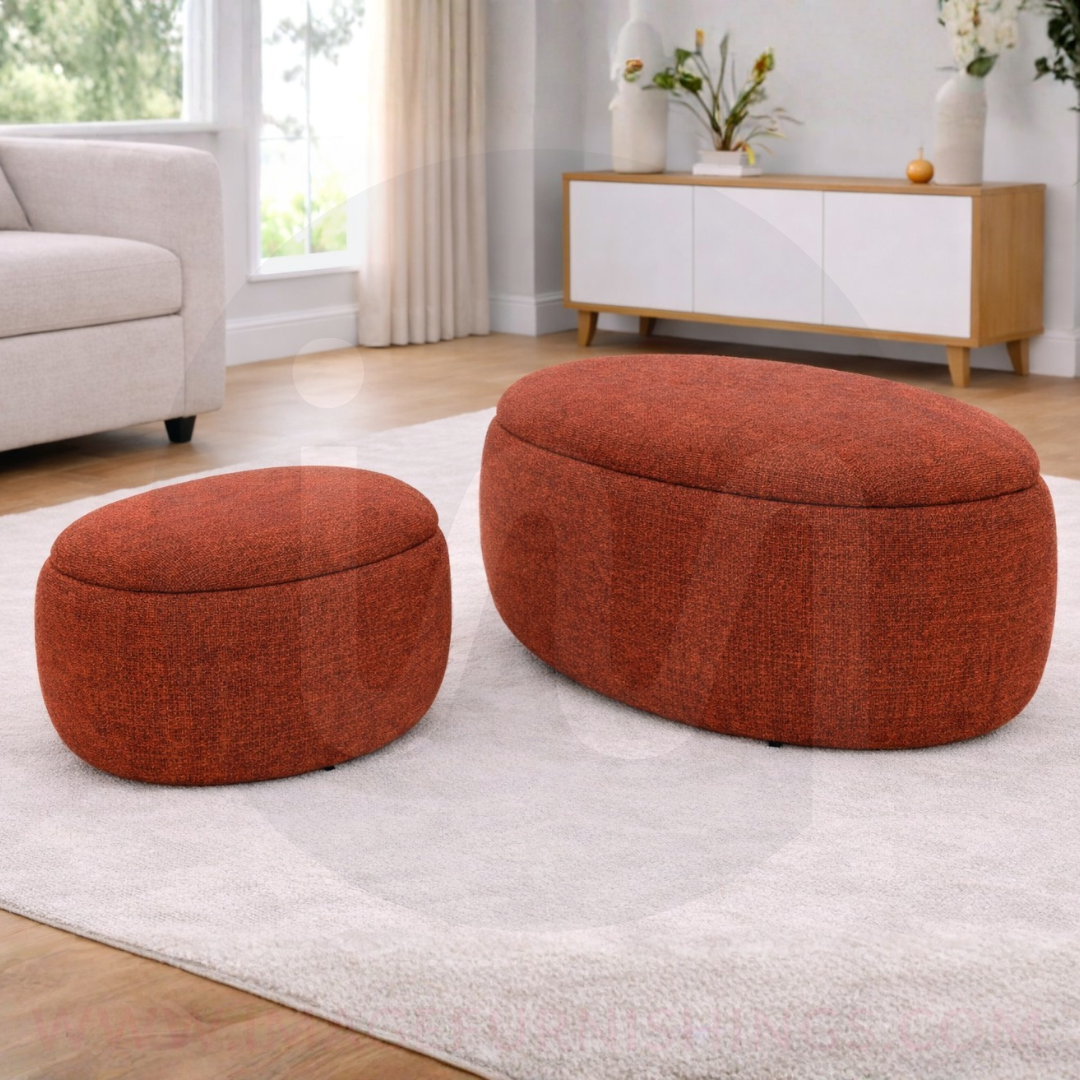 These storage ottomans feature soft, rounded shapes and a clean, modern look that suits any living space. Each one offers hidden storage beneath a cushioned lid, making them ideal for tidying away everyday items while doubling as a footstool or extra seat.